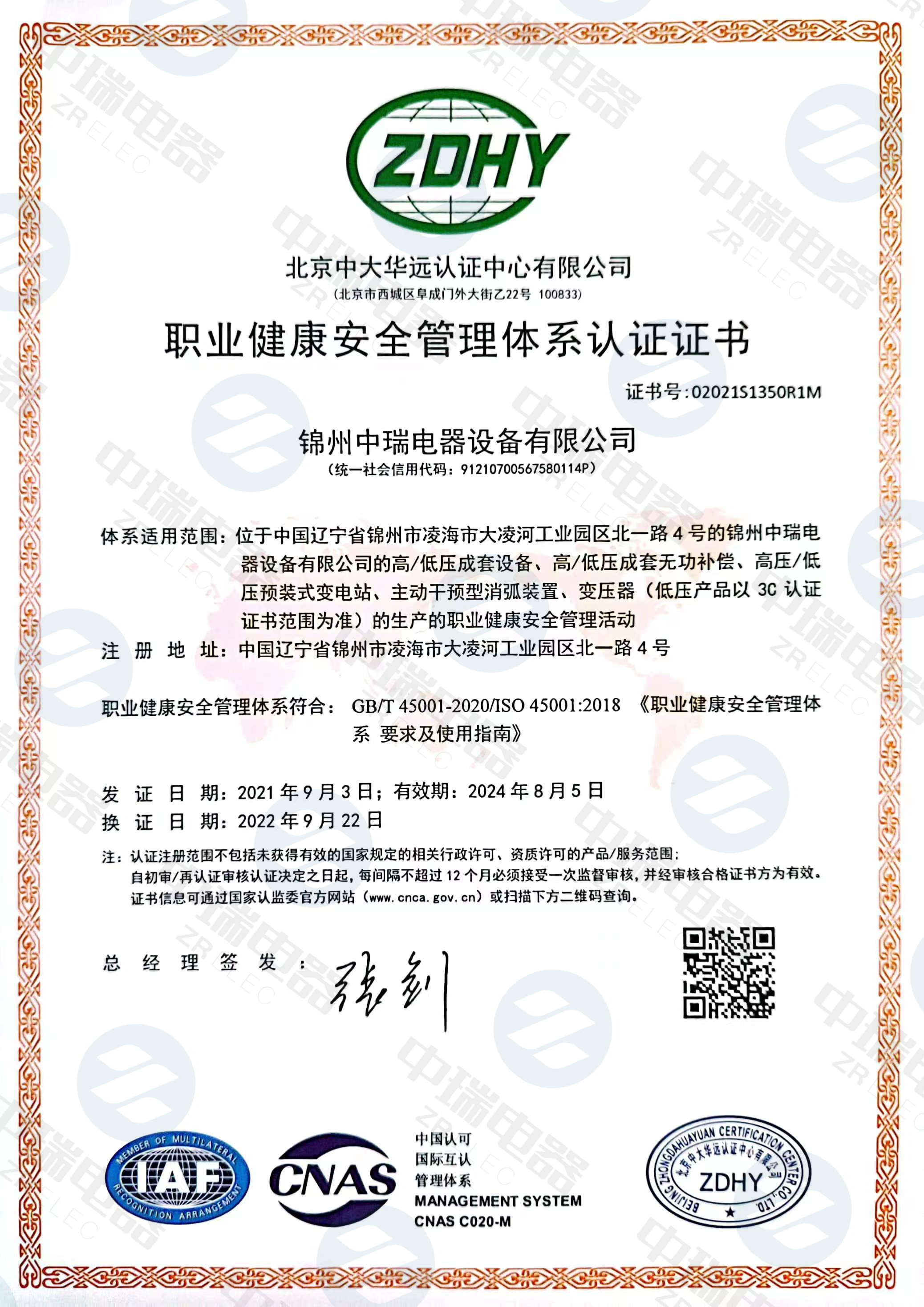 職業(yè)健康安全體系認(rèn)證證書